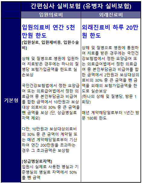 간편 실비는 기본형 실손 의료비만으로 이루어져 있습니다. 다만 급여와 비급여로 세분화되지 않고 기본형에 급여 및 비급여 치료가 포함된 형태의 단독실손보험 입니다.