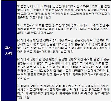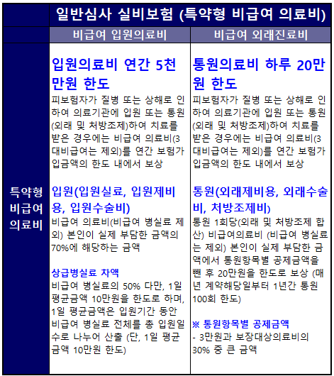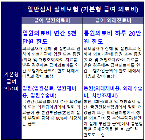 급여 및 비급여 실손 의료비는 입원의료비와 통원비(외래진료 및 처방조제비)로 나눠서 보장 금액 한도와 한도 일수, 한도 회수 내에서 본인 부담금 차감 후 실손 비례보상을 합니다. 3대 비급여 실손 의료비는 입원과 통원의 구분은 없으며 보장금액 한도와 한도 일수 한도 회수 내에서 본인 부담금 차감 후 실손 비례 보상합니다.