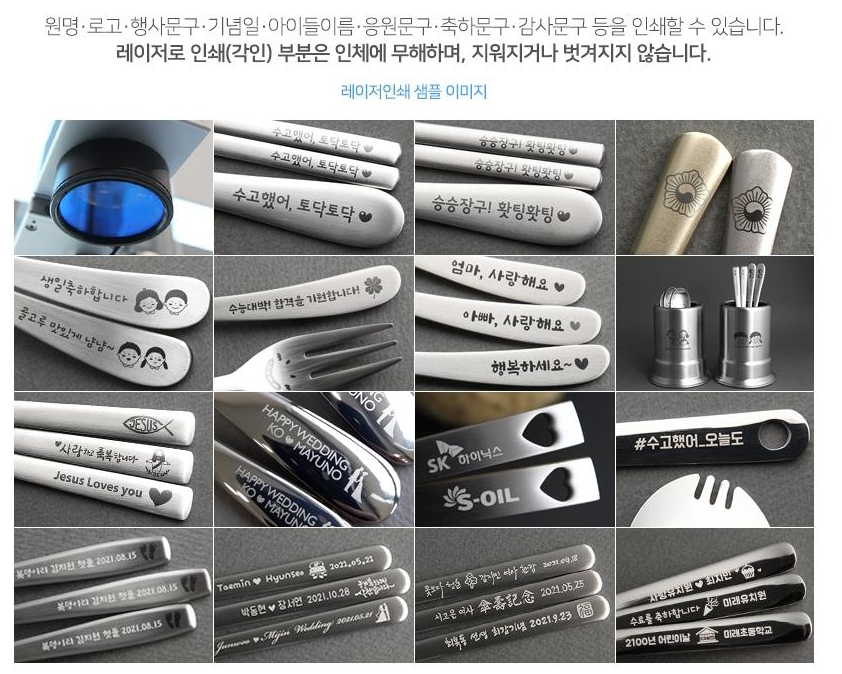 이러한 각인수저세트는 개인적인 선물은 물론, 기업의 사은품이나 기념품으로도 적합합니다. 내구성이 강한 레이저 각인은 시간이 지나도 변하지 않아, 오래도록 기억될 수 있습니다.