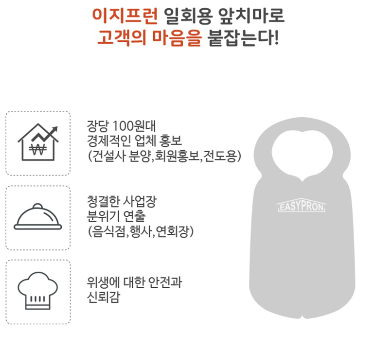 건설사 분양, 회원홍보, 전도용, 음식점 행사, 연회장 행사, 단체 행사장 이벤트 등에서 일회용 앞치마를 인쇄하여 청결한 사업장 분위기 및 자연스러운 홍보효과를 볼 수 있습니다.