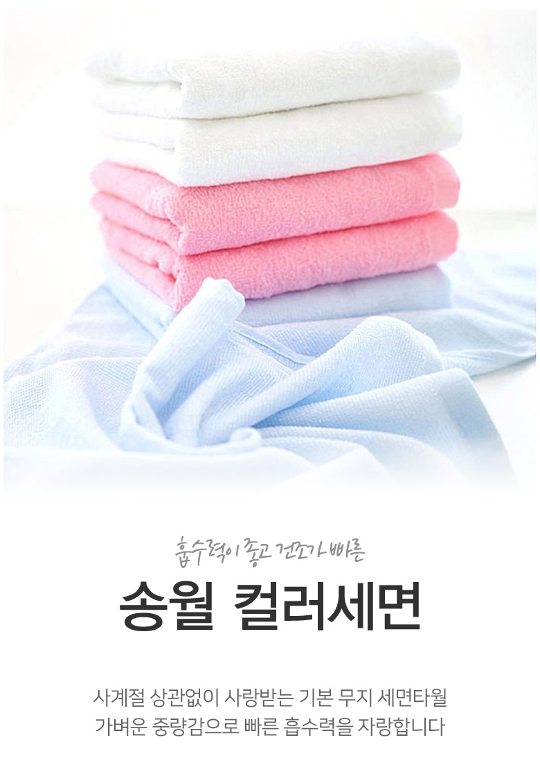 - 사계절 내내 사랑받는 기본 무지 세면타올입니다. 간단하지만 필수적인 아이템으로 고객에게 깊은 인상을 남깁니다.