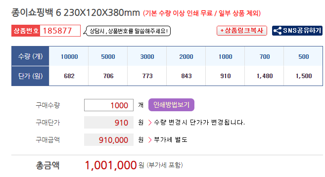 고객님께서는 230X120X380mm 사이즈의 종이가방제작 1000개를 의뢰하셨어요. 제품 단가는 910원으로 총 종이가방제작 비용은 910,000원(부가세 별도)이었어요. 떡집 이용 고객들이 떡을 포장하고 집으로 가져가실 때 사용될 종이가방제작은 떡집 이미지를 돋보이게 하고, 고객들에게 고급스럽고 정갈한 느낌을 줄 수 있도록 기획되었어요.