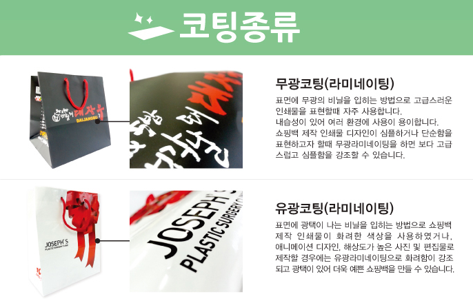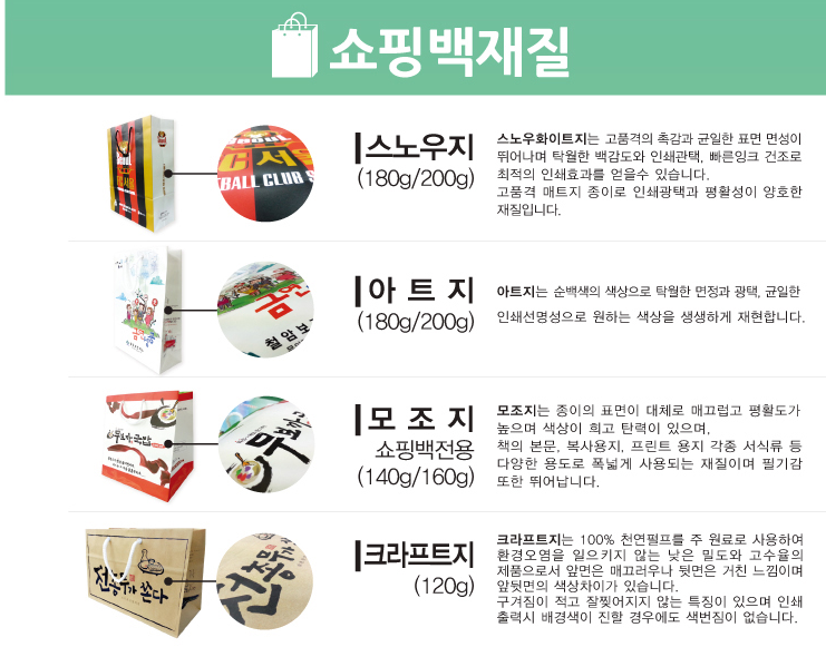 심쿵기프트에서는 국내에서 생산된 제품을 사용해요. 이번 종이쇼핑백 제작을 위해 선택할 수 있는 가방의 재질은 스노우지, 아트지, 모조지, 크라프트지 등인데요. 고객님은 고급스러운 이미지를 강조하기 위해 아트지와 무광 코팅을 선택하셨어요. 무광 코팅은 은은하고 세련된 느낌을 주기 때문에 맞춤 떡집의 고급스러운 이미지와도 잘 맞거든요.