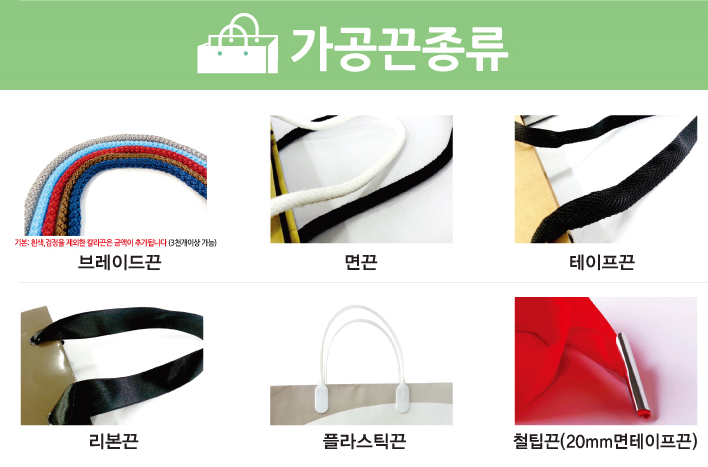 쇼핑백을 딱 잡았을 때 손잡이는 매우 중요해요. 저희는 그래서 브레이드끈, 면끈, 테이프끈, 리본끈, 플라스틱끈, 철팁끈 등 다양한 선택을 가능하게 해두었는데요. 맞춤 떡집은 클래식한 느낌을 주기 위해 브레이드끈으로 하셨어요. 브레이드끈은 견고하고 잡았을 때 편안한 느낌을 주므로 고객분들께 좋은 반응을 얻을 수 있을 것 같아요.