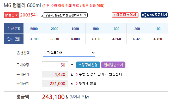 텀블러 제작 수량은 총 50개였고, 제품 단가는 4,420원이에요. 총 제작비용은 221,000원에 인쇄비용 30,000원이 추가되어, 부가세 별도로 총 251,000원이 소요되었어요.