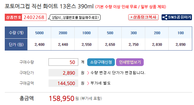 ○○베이커리 카페는 고객에게 특별한 경험을 선사하고자 고민을 했어요. 그 결과, 고객이 실제로 사용하면서 카페를 기억할 수 있는 실용적인 홍보물로 머그컵 제작을 선택하게 되었죠. 이번 프로젝트에서는 50개의 포토머그컵을 주문했어요. 머그컵의 단가는 2,890원으로, 총 제작비용은 144,500원이었고, 인쇄비용 30,000원이 추가로 들어갔답니다.(부가세 별도)