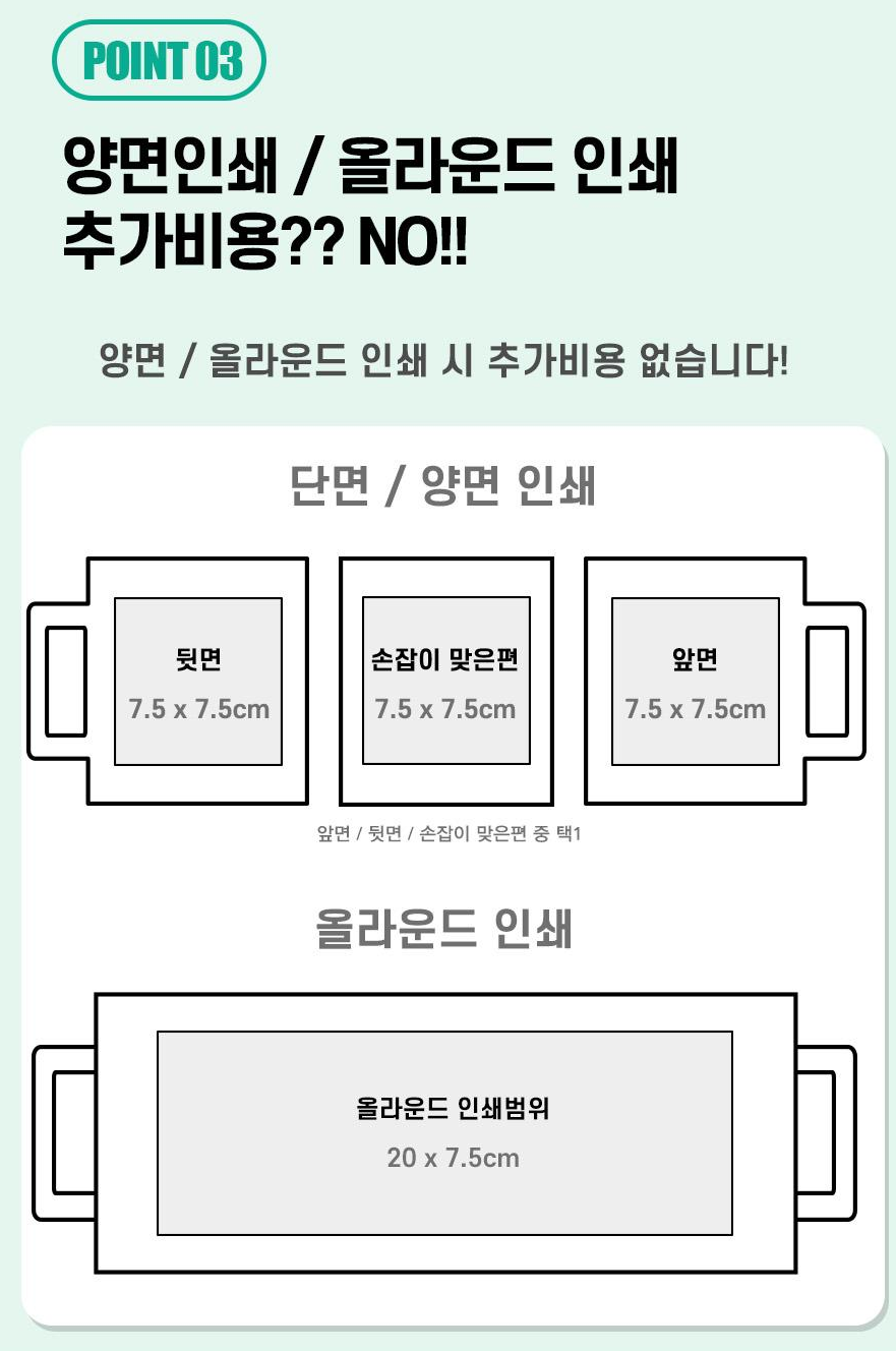 - 다양한 인쇄 옵션: 단면 인쇄는 물론 양면인쇄, 올라운드 인쇄가 가능해요. 특히 양면, 올라운드 인쇄 시 추가비용이 들지 않아 매우 경제적이에요.