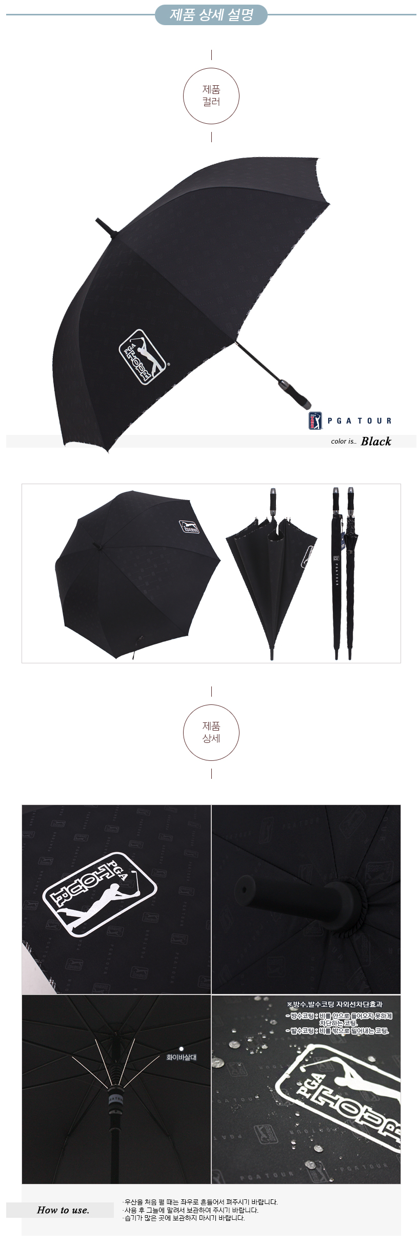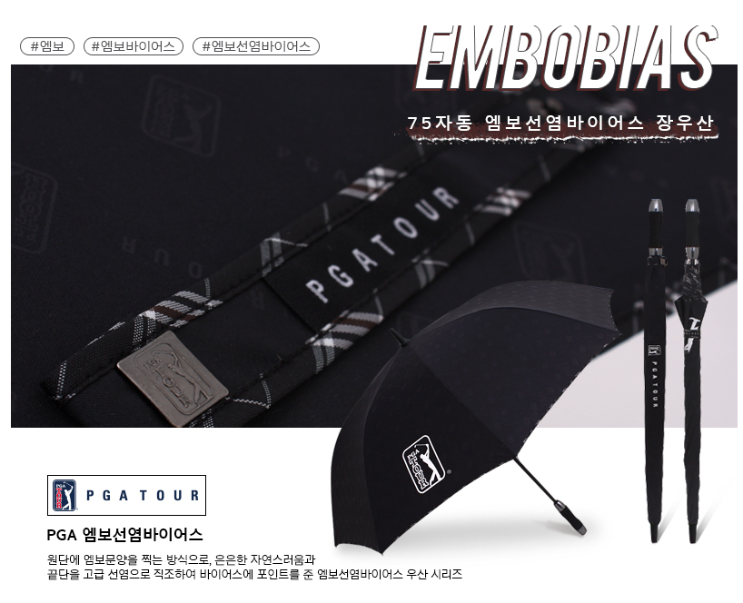 이 골프우산의 가장 큰 특징은 원단에 엠보문양을 찍어 은은한 자연스러움을 더하고, 끝단을 고급 선염으로 직조하여 바이어스에 포인트를 준 점이에요. 이 우산은 PGA 투어 정품 장우산으로, 품질 면에서 확실히 보장된 제품이죠.