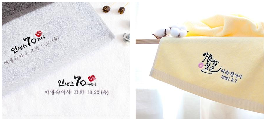 환갑과 칠순은 가족과 함께하는 의미 있는 행사입니다. 이때 타올답례품은 연세가 있으신 분들에게 실용적이면서도 품격 있는 선물이 됩니다. 인쇄된 타올에 어르신의 이름이나 생신을 기념하는 문구를 넣어 더욱 특별하게 제작할 수 있습니다. 고급스러운 재질과 디자인으로 장식된 타올은 오래도록 소중히 간직될 것입니다.