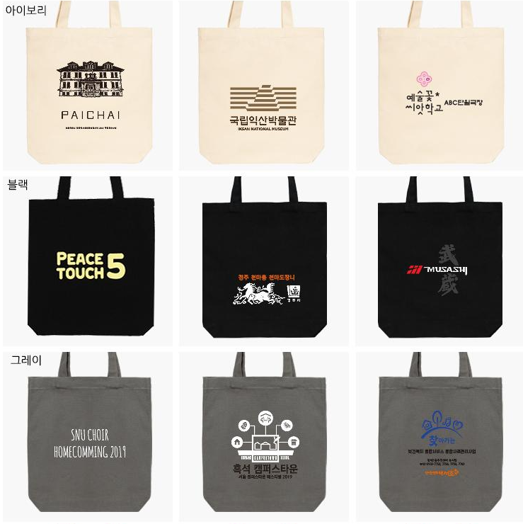 - 동호회, 친목회, 봉사 단체 등에서 단체 로고가 새겨진 에코백을 굿즈로 제작해 소속감을 강화하세요.