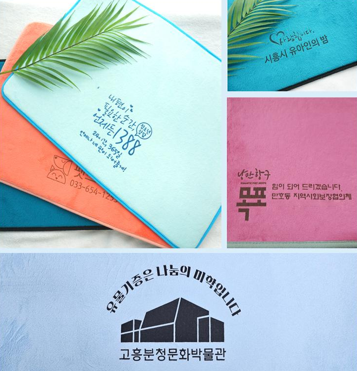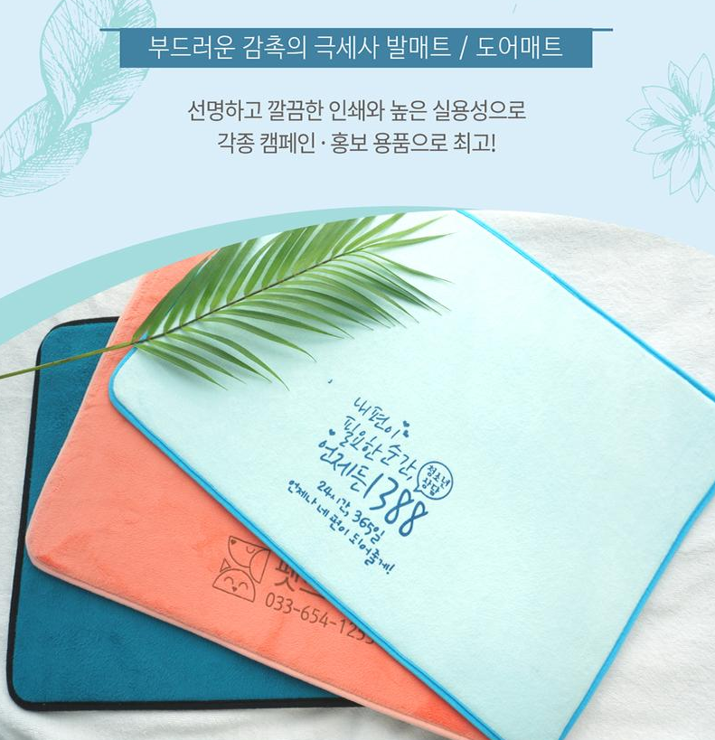 발매트나 러그는 다른 판촉물에 비해 상대적으로 실용성이 뛰어나고, 장기간 사용 가능하며, 노출 빈도가 높은 제품입니다.