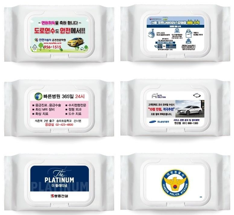 - 특징: 위생적이고 사용이 편리한 캡형 물티슈로, 소량 주문도 가능합니다. 컬러 스티커를 부착해 눈에 띄는 홍보 효과를 얻을 수 있습니다.
