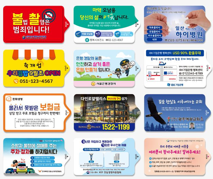 단가가 낮아 대량 제작이 가능하고, 다양한 행사에서 부담 없이 배포할 수 있습니다. 전단지나 명함과 달리 버려지지 않고 사용되기 때문에 투자 대비 효과가 훨씬 큽니다. - 다양한 디자인과 포맷으로 브랜드 이미지 강화