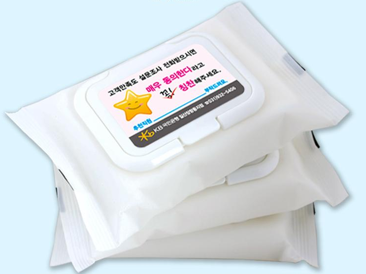 실생활에서 자주 사용되는 물티슈는 고객의 일상에 자연스럽게 스며드는 판촉물입니다. 브랜드 이름과 로고가 인쇄된 물티슈를 사용할 때마다 고객은 브랜드를 다시 떠올리게 됩니다. - 고객 만족도 향상