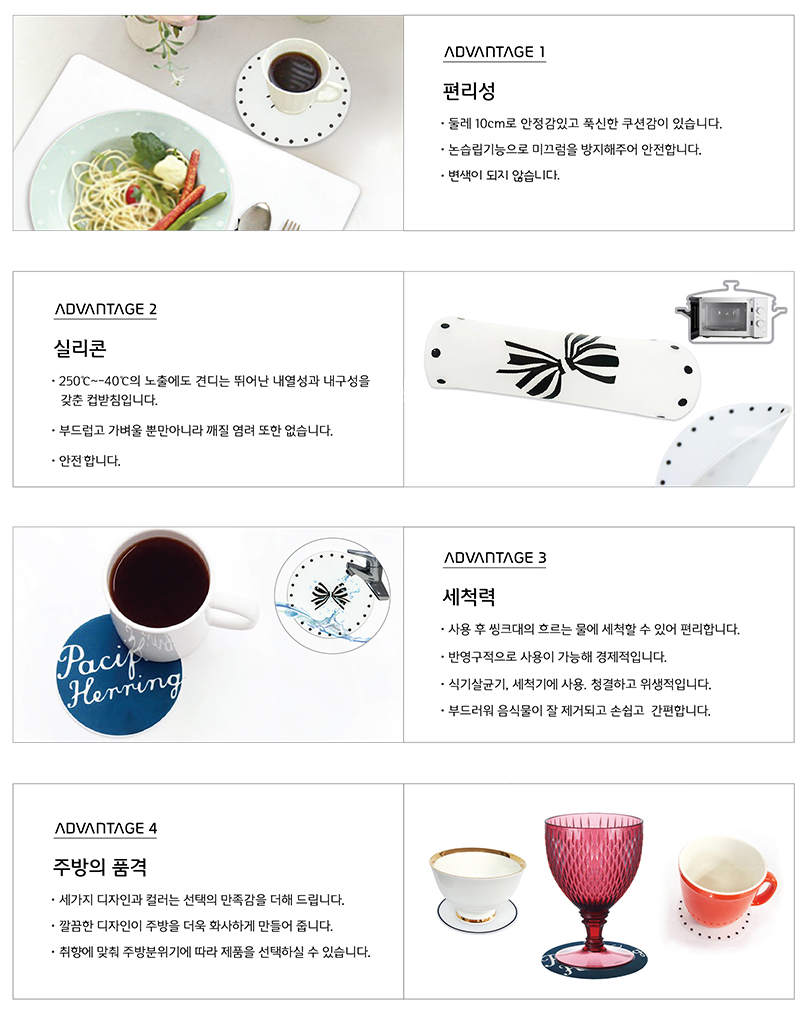 - 내열성, 논슬립, 물세척 가능 / 실크인쇄 가능
