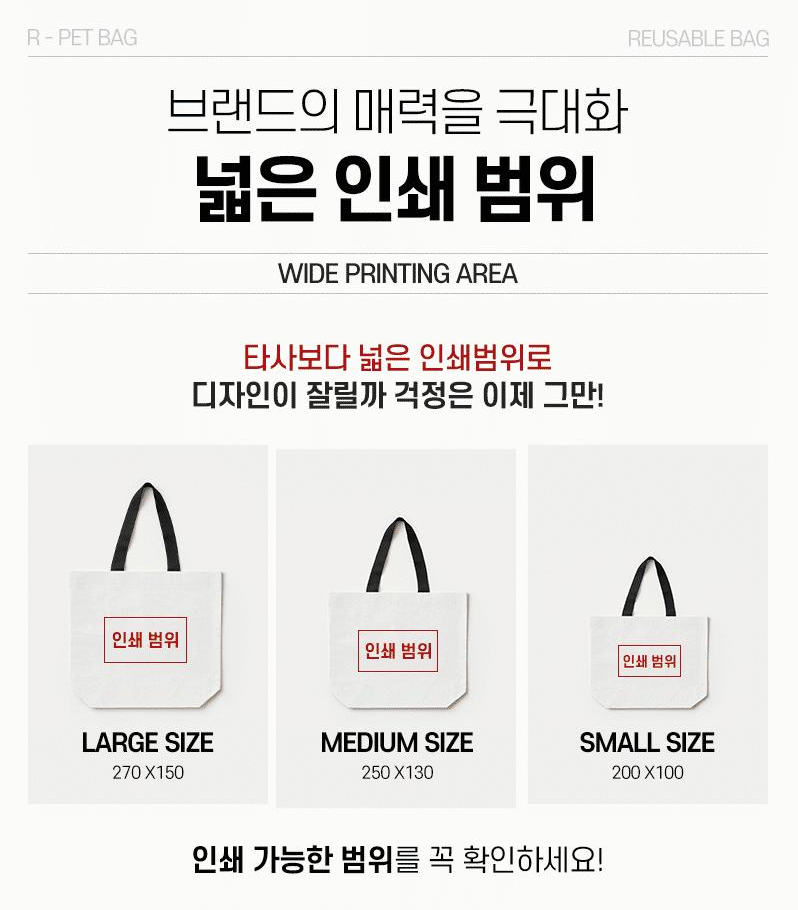 이 리유저블백은 타사보다 넓은 인쇄 범위를 제공하며, 1도부터 4도까지 다양한 색상의 인쇄가 가능해 원하는 로고나 메시지를 선명하게 담을 수 있습니다.