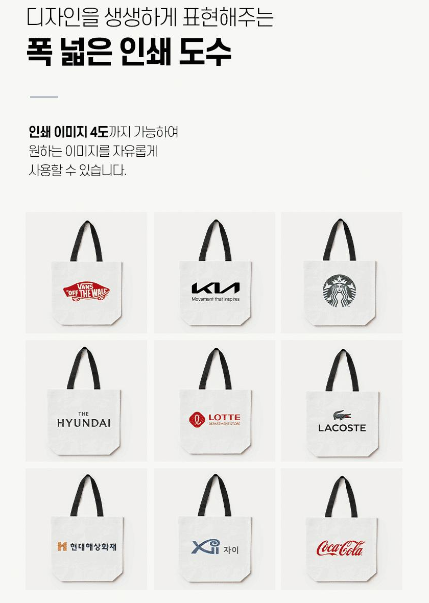 브랜드 로고는 물론, 행사명, 문구, 도형 등도 자유롭게 삽입할 수 있어 리유저블 쇼핑백 제작의 핵심인 마케팅 효과를 극대화할 수 있습니다.