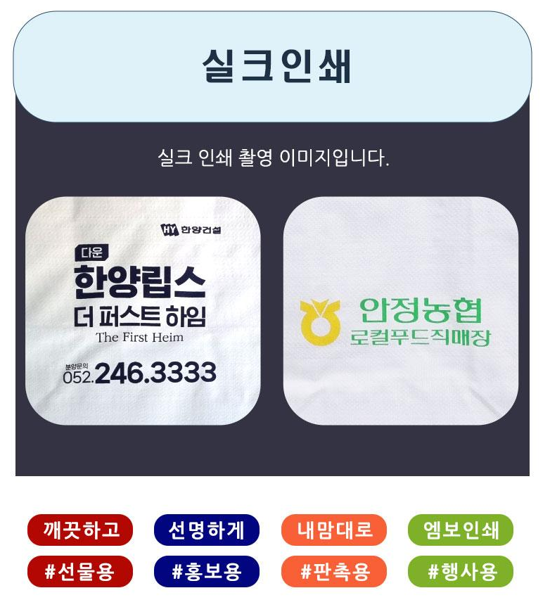 A1. 실크인쇄 또는 컬러엠보 인쇄 중 선택 가능하며, 인쇄비용은 별도입니다.
