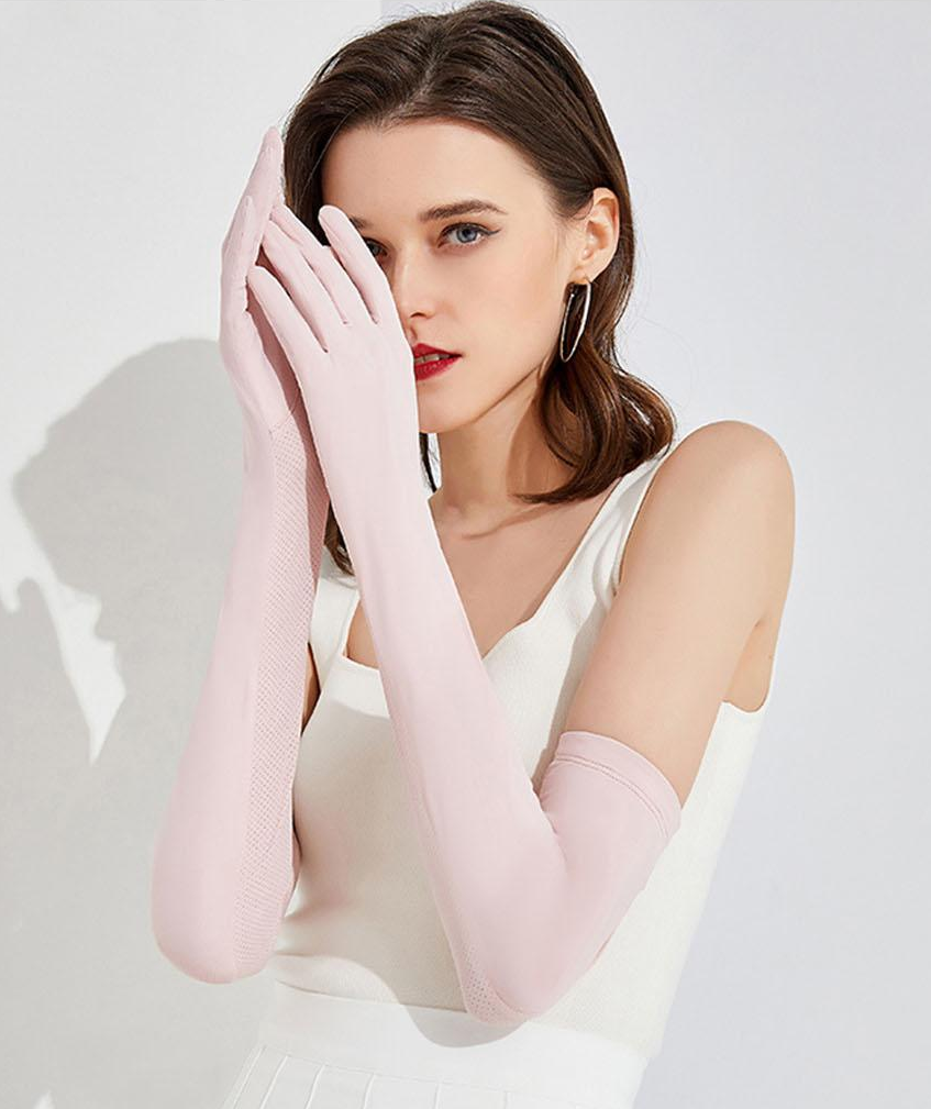 - 여성 전용 디자인으로 손등부터 손가락까지 완전히 덮는 풀커버 타입이며, 부드러운 소재감과 손바닥 미끄럼 방지 기능이 특징입니다.