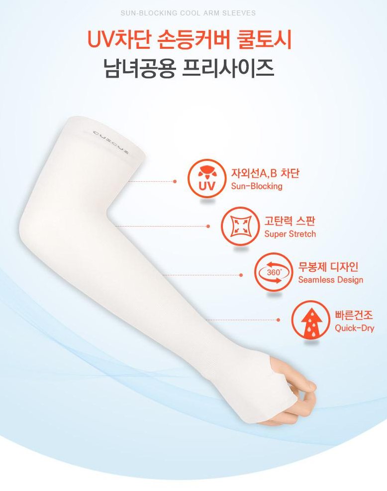- 손등을 감싸는 구조로 자외선 A, B 모두를 99.9% 차단하며, 통기성과 신축성이 뛰어난 스판 소재로 제작되었습니다.