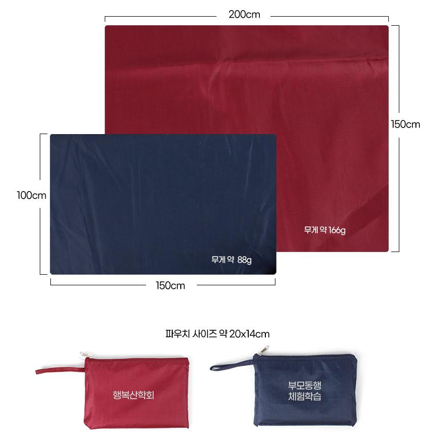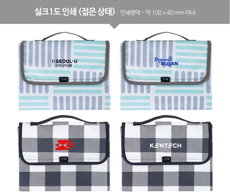 휴대용 피크닉 돗자리 제작은 대소 사이즈 선택이 가능하며 60개부터 소량제작이 가능합니다. 간편하게 접어서 휴대하기 편리한 구조로 되어 있으며, 고리 손잡이가 달린 지퍼형 보관용 파우치가 제공됩니다.
