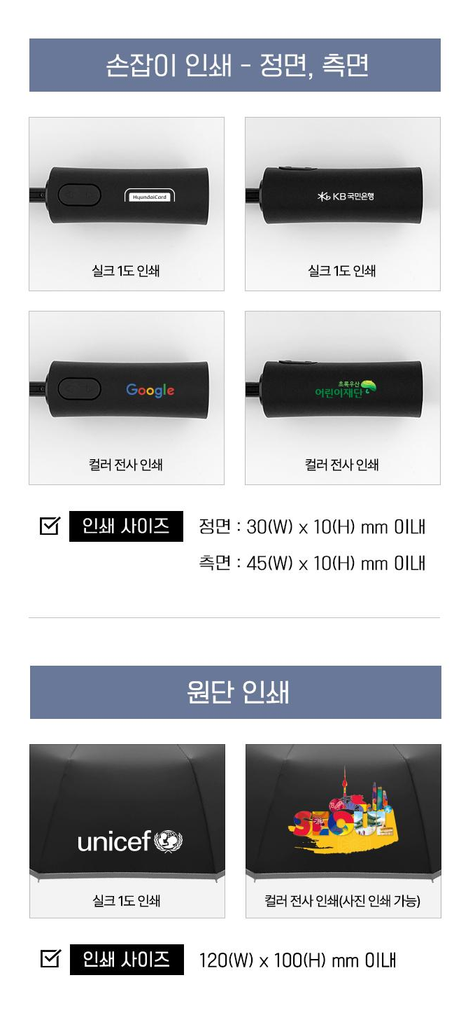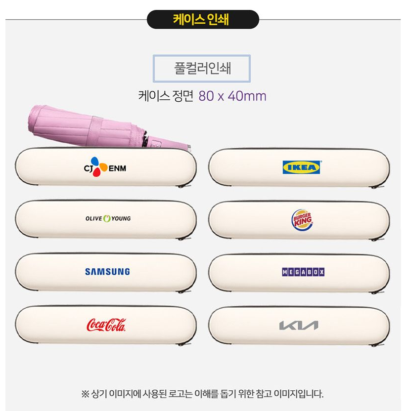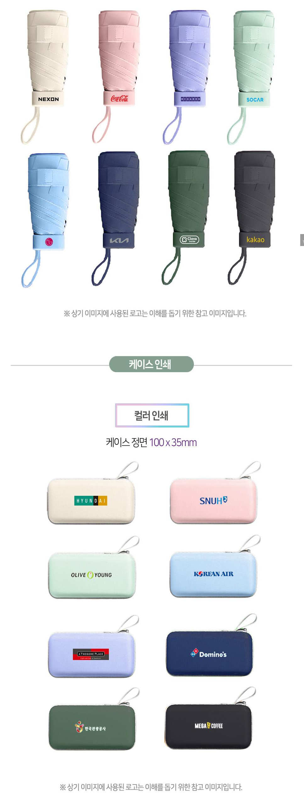 초미니 사이즈임에도 양산과 우산 겸용으로 사용할 수 있어 실용성이 뛰어나며, 우산 손잡이 인쇄와 하드케이스 컬러 인쇄로 확실한 홍보 효과를 기대할 수 있습니다.
