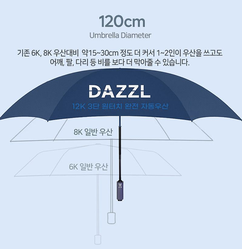 3단우산이면서도 직경 120cm의 대형 사이즈를 자랑하는 프리미엄 제품입니다. 완전자동 원터치 시스템과 12K 우산살로 내구성이 뛰어나며, 이중 방풍 살대로 강한 바람에도 뒤집히지 않습니다.