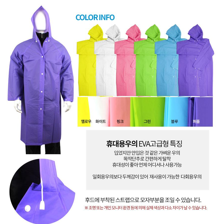 옐로우, 화이트, 핑크, 그린, 블루, 퍼플의 다양한 색상으로 제작 가능한 EVA 소재 우비입니다. 일반 비닐우의와 달리 부드러운 EVA 소재로 제작되어 착용감이 뛰어나며, 재사용이 가능해 경제적입니다.