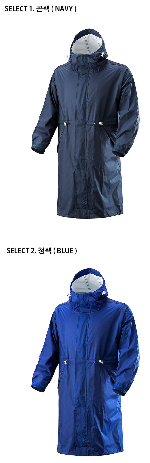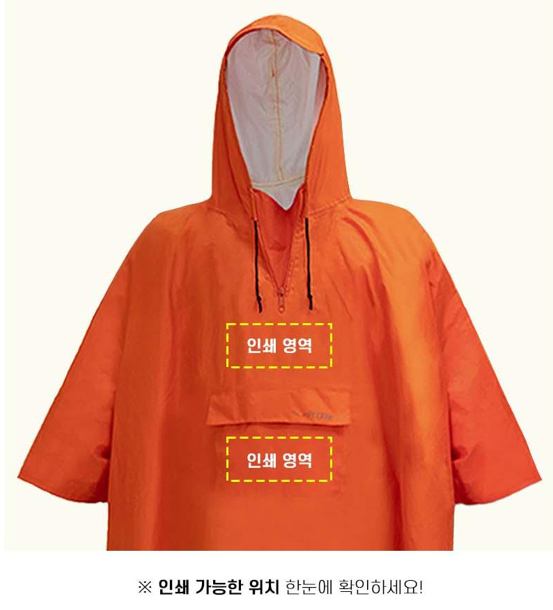 네이비와 오렌지 색상으로 제작되는 전문적인 판초형 우의입니다. 폴리에스테르 원단으로 제작되어 튼튼한 내구성을 자랑하며, 체형 조절이 가능한 허리 벨트가 있어 다양한 체형에 맞게 착용할 수 있습니다.