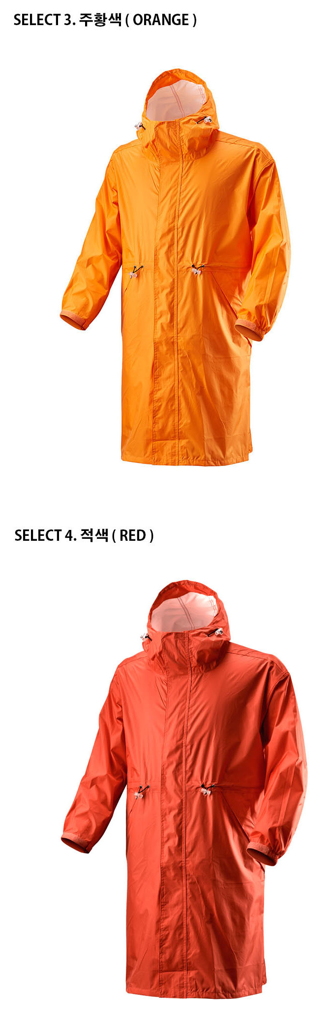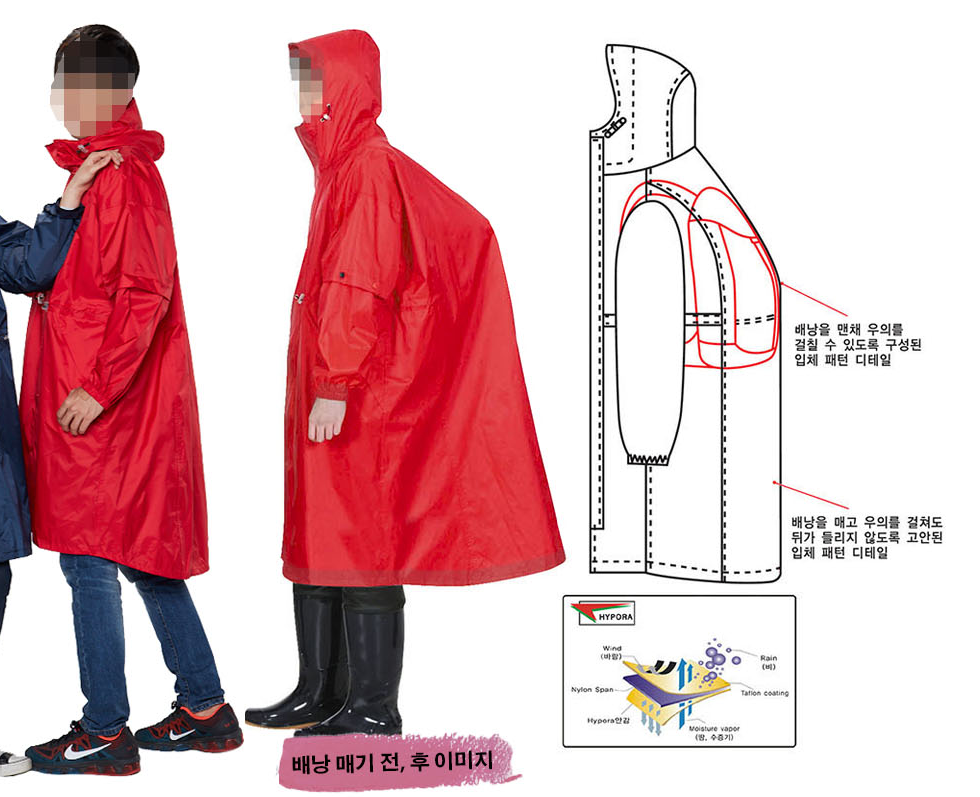 적색, 곤색, 청색, 오렌지색으로 선택 가능한 전문 등산용 우비입니다. 하이포리 원단으로 제작되어 방수성과 통기성이 뛰어나며, 비와 바람은 막아주면서 내부의 습기와 땀은 효과적으로 발산시킵니다.