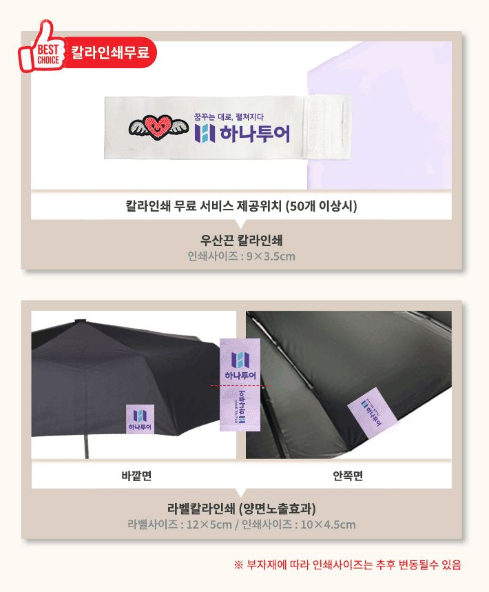 10가지 산뜻한 색상과 200배 활용 가능한 2배 넓은 우산끈이 특징입니다. 넓은 우산끈에 무료 컬러인쇄가 가능하여 더욱 매력적인 양산답례품 제작이 가능하며, 손잡이 인쇄, 원단인쇄, 우산끈 컬러인쇄, 라벨컬러인쇄 등 다양한 인쇄 옵션을 제공합니다.