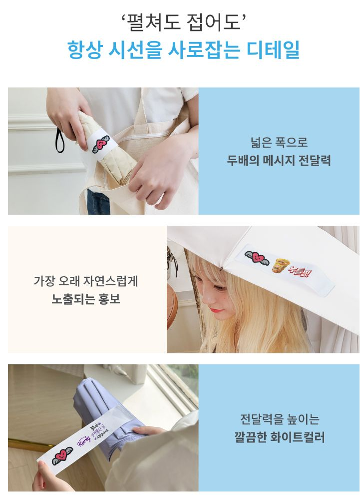 또한 SNS 시대에 맞춰 예쁜 디자인의 우산은 자연스럽게 소셜미디어에 노출되면서 바이럴 마케팅 효과까지 기대할 수 있습니다. 실제로 한 카페 브랜드에서 제작한 파스텔 톤의 미니 양우산이 인스타그램에서 화제가 되면서 매출 증가로 이어진 사례도 있습니다.