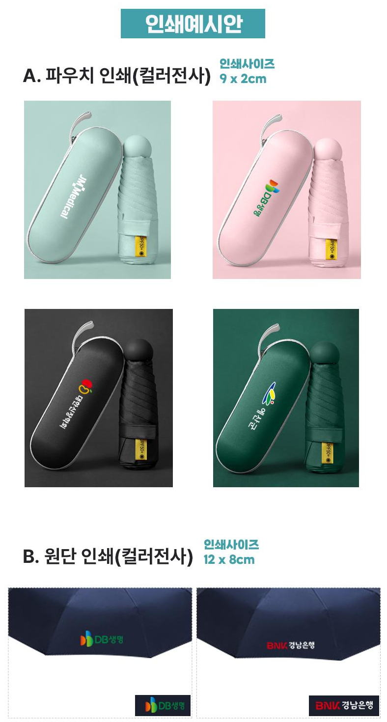 뛰어난 기능성을 자랑하는 미니 사이즈 제품입니다. 핑크, 스카이, 퍼플, 민트그린, 다크그린, 네이비, 블랙 등 7가지 색상 선택이 가능하며, 우수한 자외선 차단율과 열차단 효과를 제공합니다. 강풍에 강한 6개의 우산살로 방풍 기능을 갖추고 있으며, 블랙코팅 원단과 방수 기능으로 실용성을 극대화했습니다. 케이스가 무료로 증정되며, 파우치 컬러인쇄와 원단 컬러인쇄를 통한 효과적인 판촉이 가능합니다.