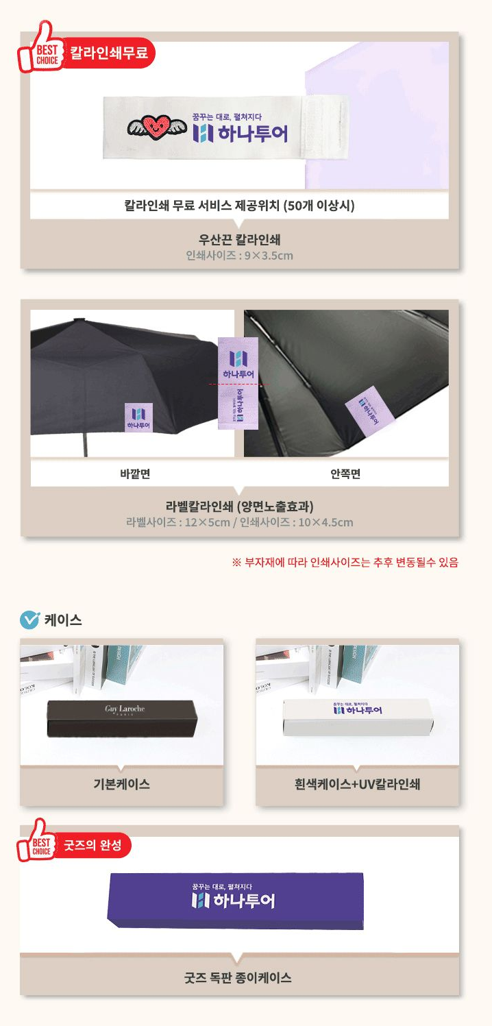 홍보 효과를 극대화한 혁신적인 디자인의 제품입니다. 블랙, 블루, 베이지, 크림, 그린 등 5가지 색상 선택이 가능하며, 일반 우산 끈보다 2배 넓은 우산끈에 컬러인쇄 무료 서비스를 제공하여 200배 높은 활용도를 자랑합니다. 우산 손잡이 컬러인쇄와 레이저 각인, 원단 컬러인쇄까지 가능하여 펼쳤을 때와 접었을 때 모두 시선을 사로잡는 홍보 효과를 발휘합니다. 다양한 우산 굿즈 제작에 적합한 대표 제품입니다.