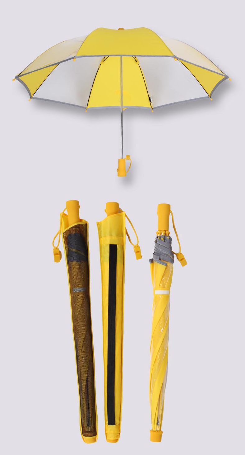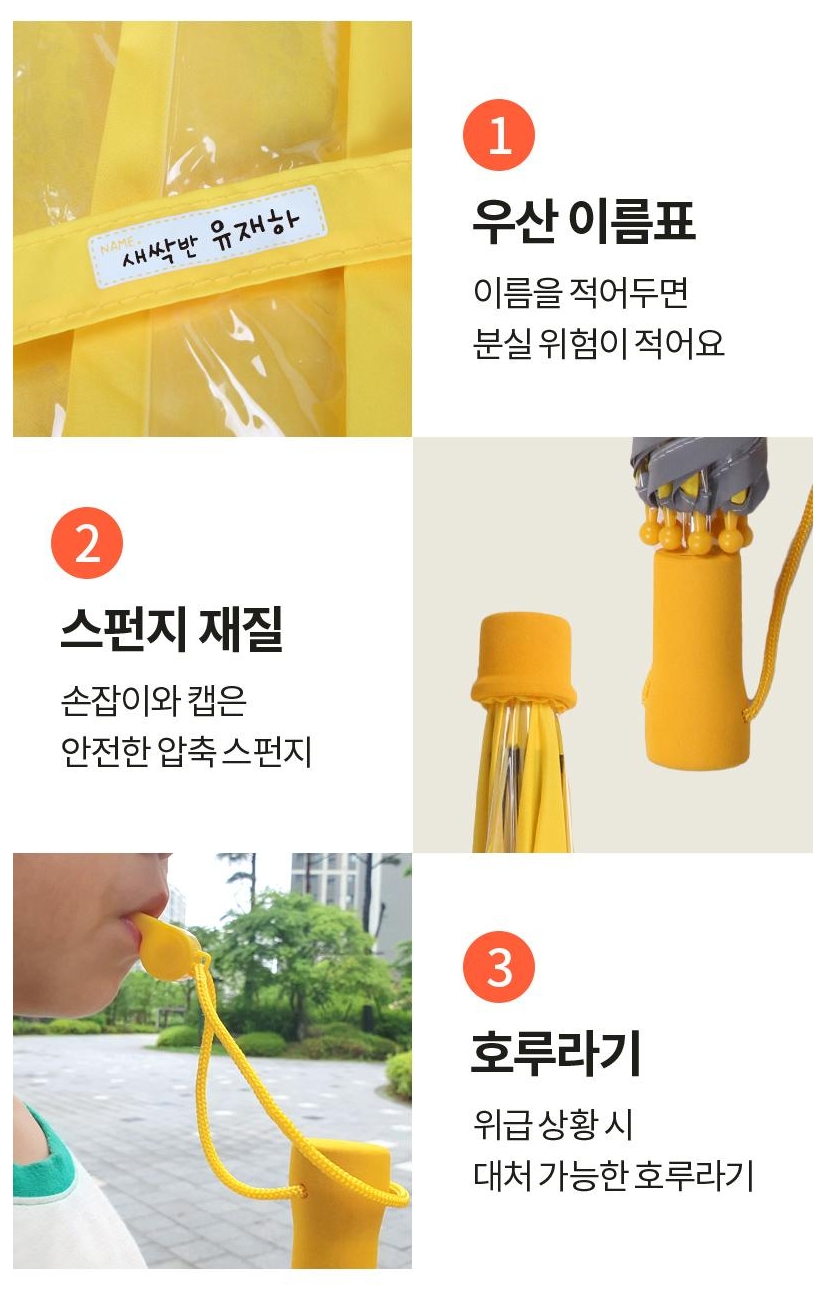 안전한 라운드 팁 처리로 찔림이나 긁힘 사고를 완전히 방지하며, 위급 시 사용 가능한 호루라기가 부착되어 응급 상황 대응이 가능합니다. 안전한 무 걸쇠 슬라이드 수동 우산으로 걸쇠에 손이 다칠 염려가 전혀 없어 어린이들이 안심하고 사용할 수 있습니다.