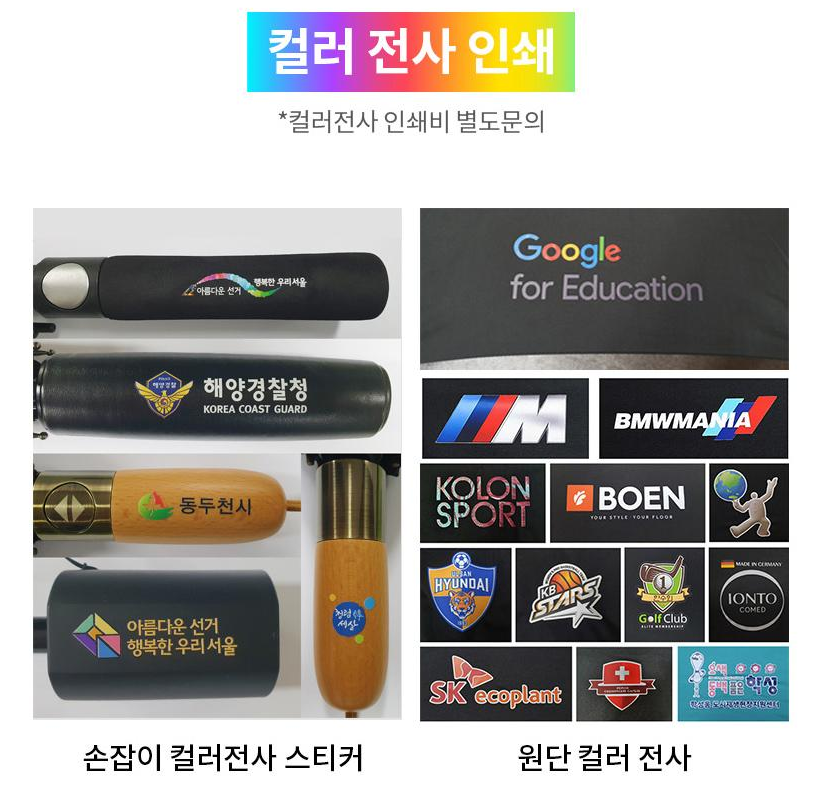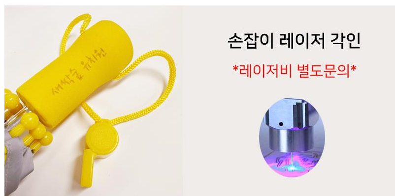 안전한 스펀지 손잡이 및 스펀지 우산캡으로 부드러운 감촉을 제공하며, 고무 멜빵 주머니가 있어 우산 분실 걱정이 없습니다. 우산 이름표가 있어 분실 시에도 쉽게 찾을 수 있으며, 우산 손잡이 및 원단 인쇄가 가능하고 컬러전사 인쇄와 레이저 각인까지 지원합니다.