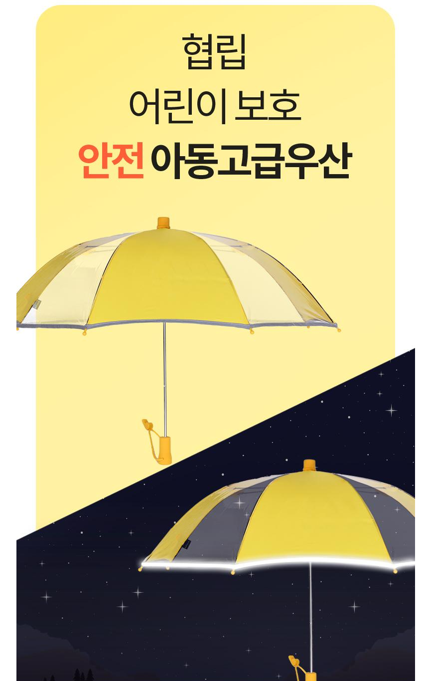 반사띠 부착으로 어두운 밤에 야광띠가 반사되어 탁월한 안전성을 확보했으며, 어린이 안전품질표시를 반영한 우산살 원형 마감처리로 날카로운 부분이 전혀 없습니다. 어린이 안전품질표시를 반영한 4cm이하의 안전 우산캡으로 머리 보호까지 고려했습니다.