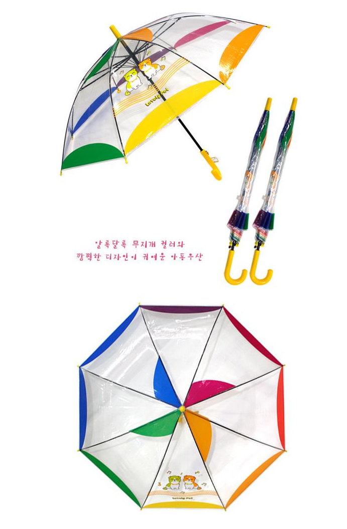 알록달록 무지개 컬러와 깜찍한 디자인이 적용되어 어린이들이 좋아하는 귀여운 외관을 자랑합니다. 투명원단으로 안전한 시야를 확보하여 우천 시에도 주변 상황을 정확히 파악할 수 있습니다.
