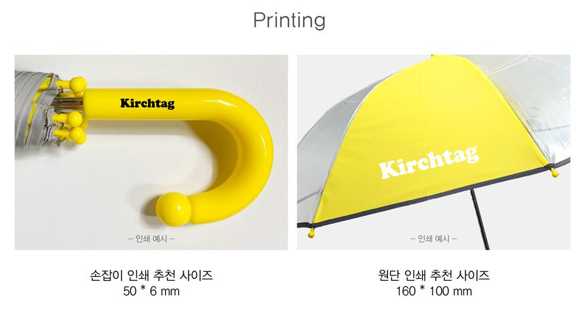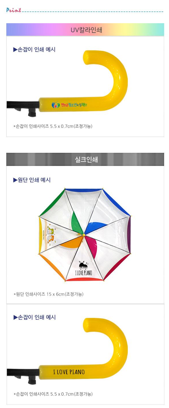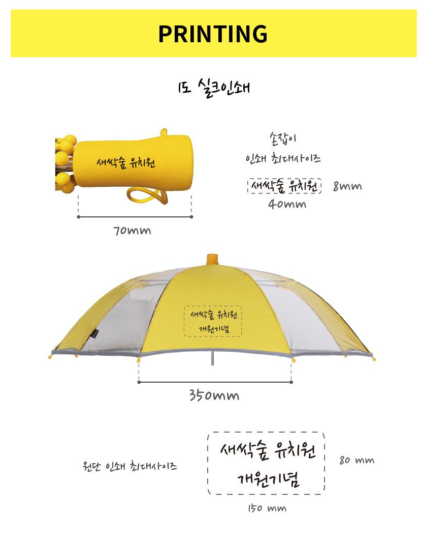 손잡이 인쇄, 원단인쇄, 손잡이+원단인쇄를 선택할 수 있어 기관의 로고나 어린이 이름, 안전 메시지 등을 다양하게 조합하여 인쇄할 수 있습니다. 올라운드 투명 설계로 기존 부분 투명 우산 대비 더욱 넓은 시야각을 제공하여 안전성이 한층 강화되었습니다.