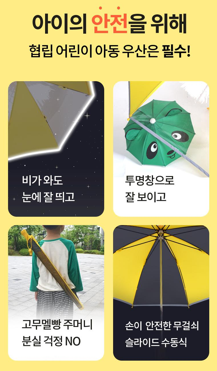 반사띠 부착으로 어두운 밤에 야광띠가 반사되어 뛰어난 안전성을 확보했으며, 어린이 안전품질표시를 반영한 우산살 원형 마감처리로 안전사고 위험을 원천 차단했습니다. 어린이 안전품질표시를 반영한 안전 우산캡으로 머리 부분 보호 기능도 갖추었습니다.