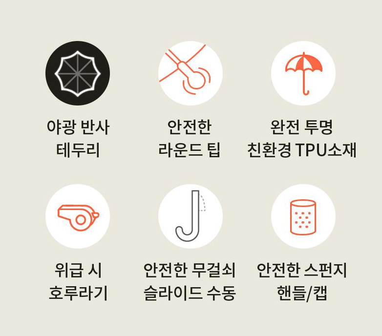 저가형 POE 비닐우산이 아닌 완전 투명한 친환경 TPU소재를 사용하여 최고 수준의 투명도를 구현합니다. 야광 반사 테두리가 부착되어 야간이나 어두운 환경에서도 뛰어난 안전성을 발휘합니다.
