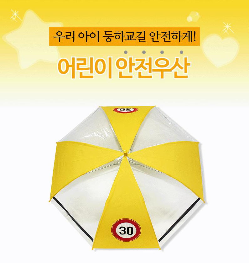 실바이어스 처리로 견고한 끝단 마감을 구현하여 내구성이 뛰어나며, 가볍고 탄성이 좋은 화이바 살대 사용으로 어린이들이 쉽게 들고 다닐 수 있습니다. 노랑 원단에 어린이 교통안전 속도제한 30km 표시가 인쇄되어 교통안전 교육 효과까지 기대할 수 있습니다.