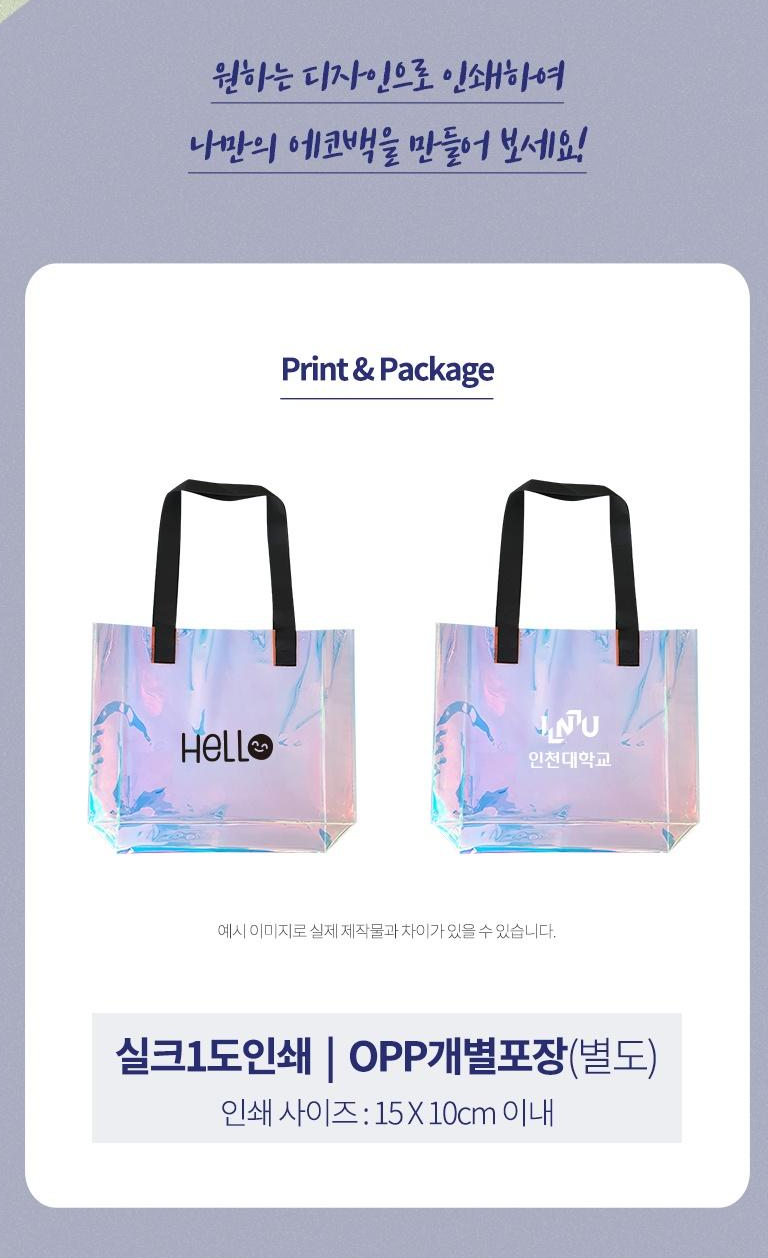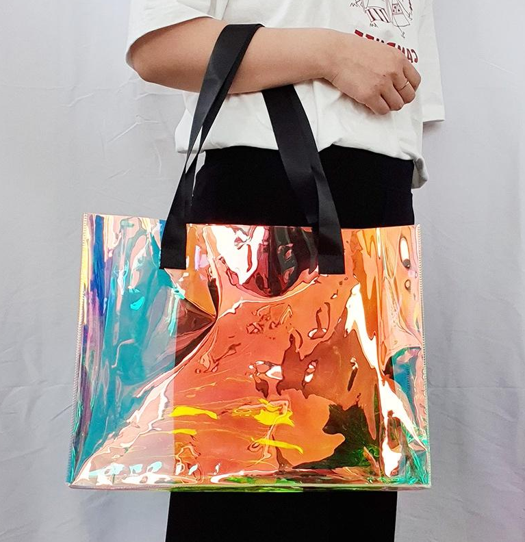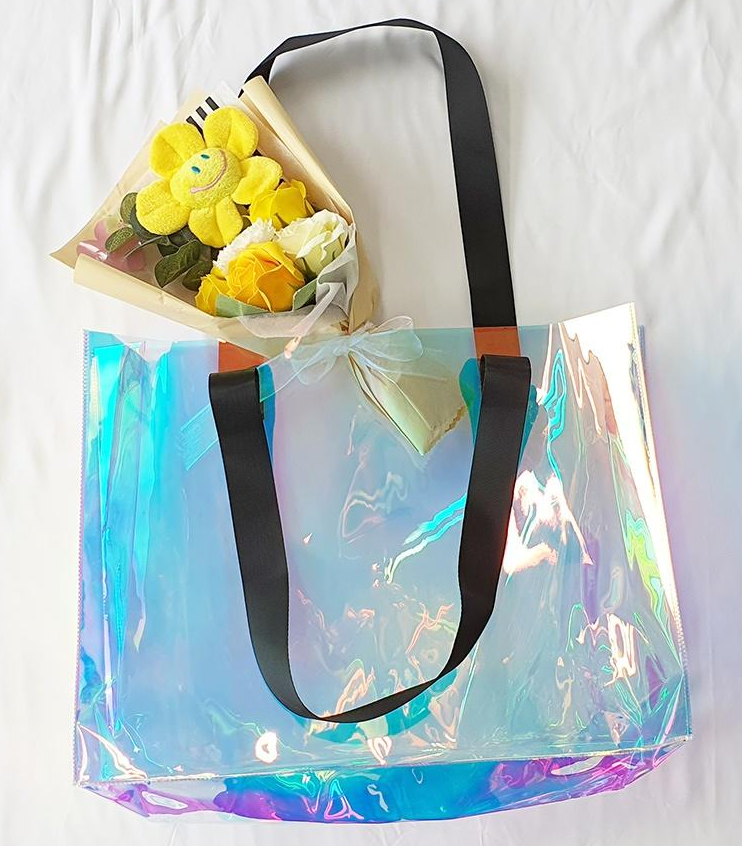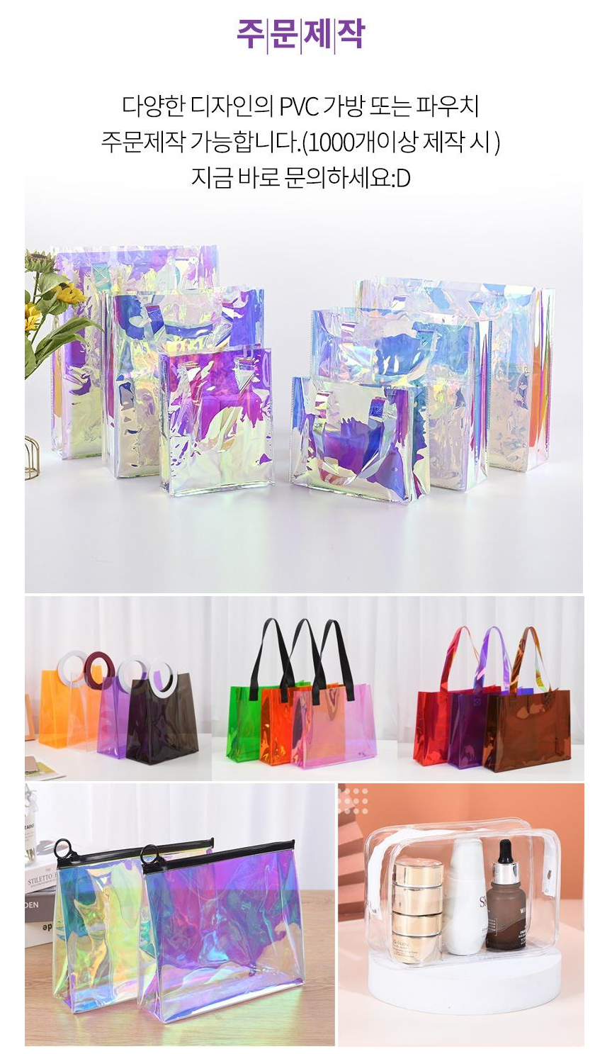400mm x 300mm x 10mm 사이즈의 PVC 홀로그램 숄더백으로 물놀이 비치백, 일상백, 장바구니, 토트백 등 다양한 용도로 활용 가능합니다. 투명 홀로그램 소재로 내용물이 보여 편리하며, 방수 기능까지 갖추고 있어 여름철 프로모션용으로 인기가 높습니다. 1000개 이상 제작 시 다양한 디자인과 사이즈로 주문제작이 가능합니다.