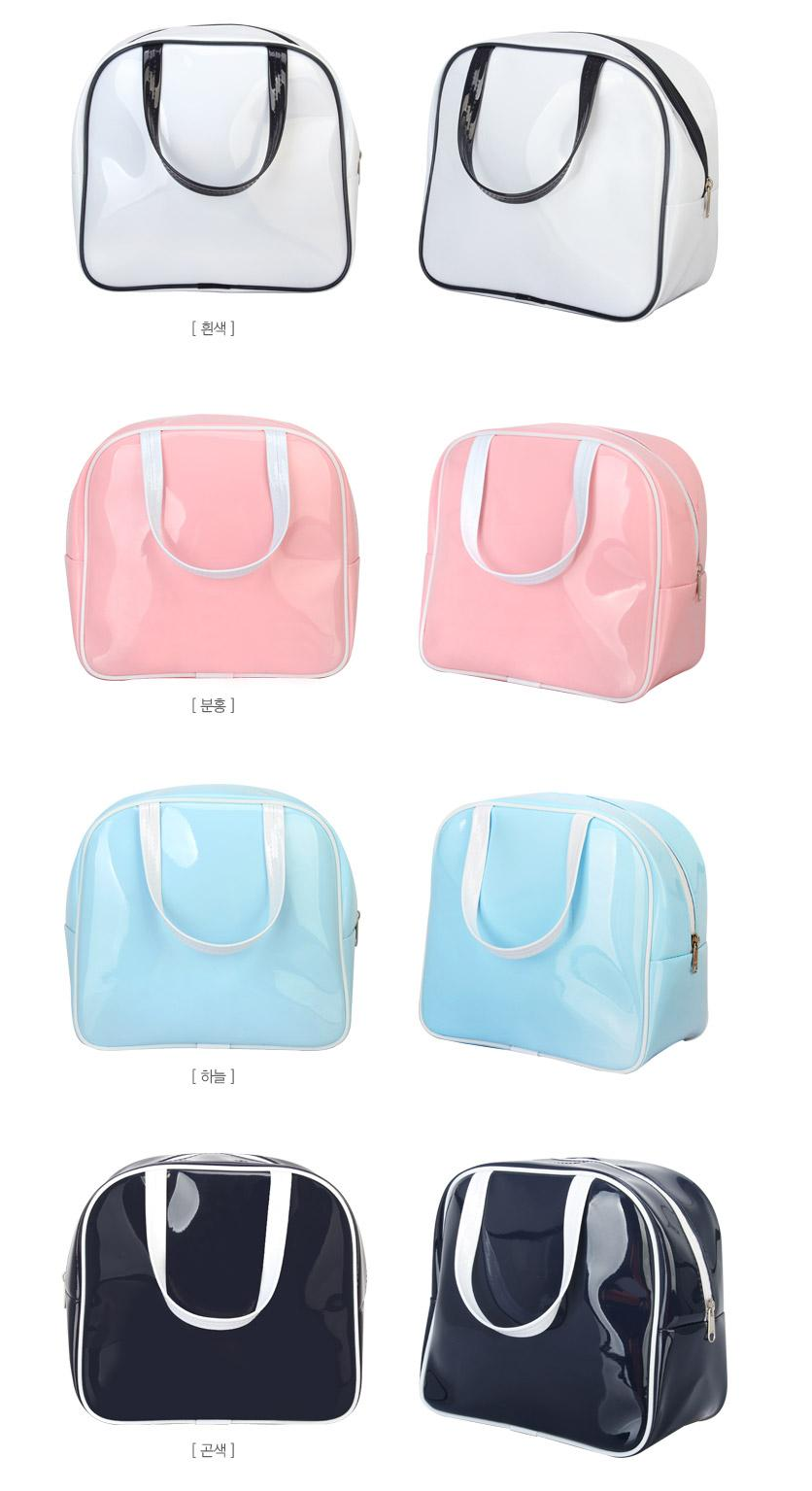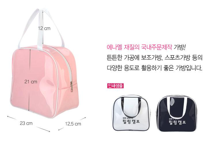 반짝반짝 빛나는 에나멜 소재로 제작되는 가방으로 흰색, 분홍색, 하늘색, 검정색, 곤색 5가지 색상으로 제작 가능합니다. 튼튼한 가공으로 보조가방이나 스포츠가방 등 다양한 용도로 사용할 수 있으며, 실크인쇄를 통해 단체 로고를 선명하게 표현할 수 있습니다.