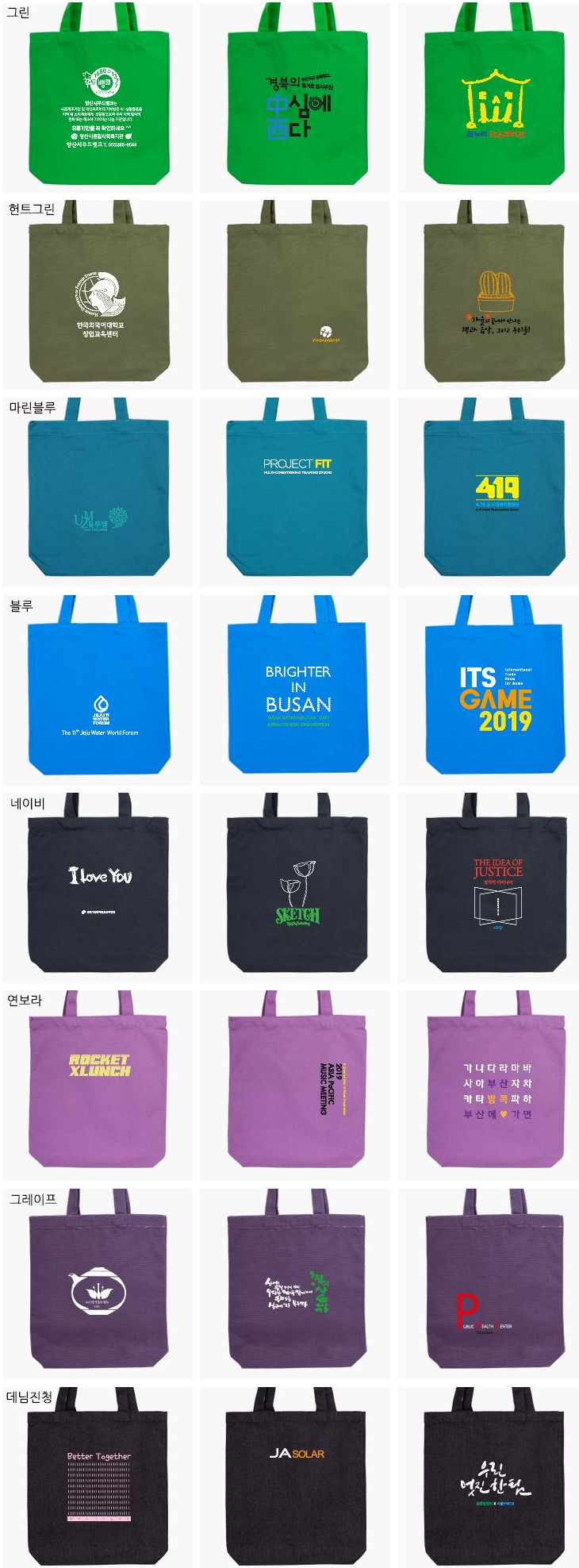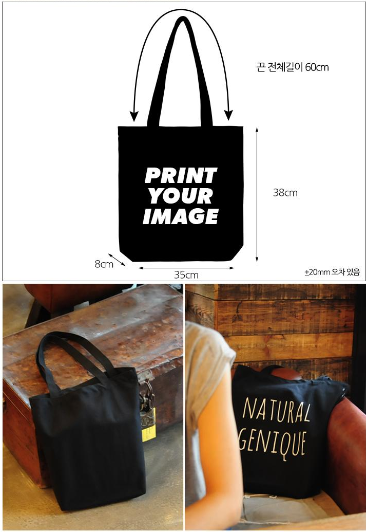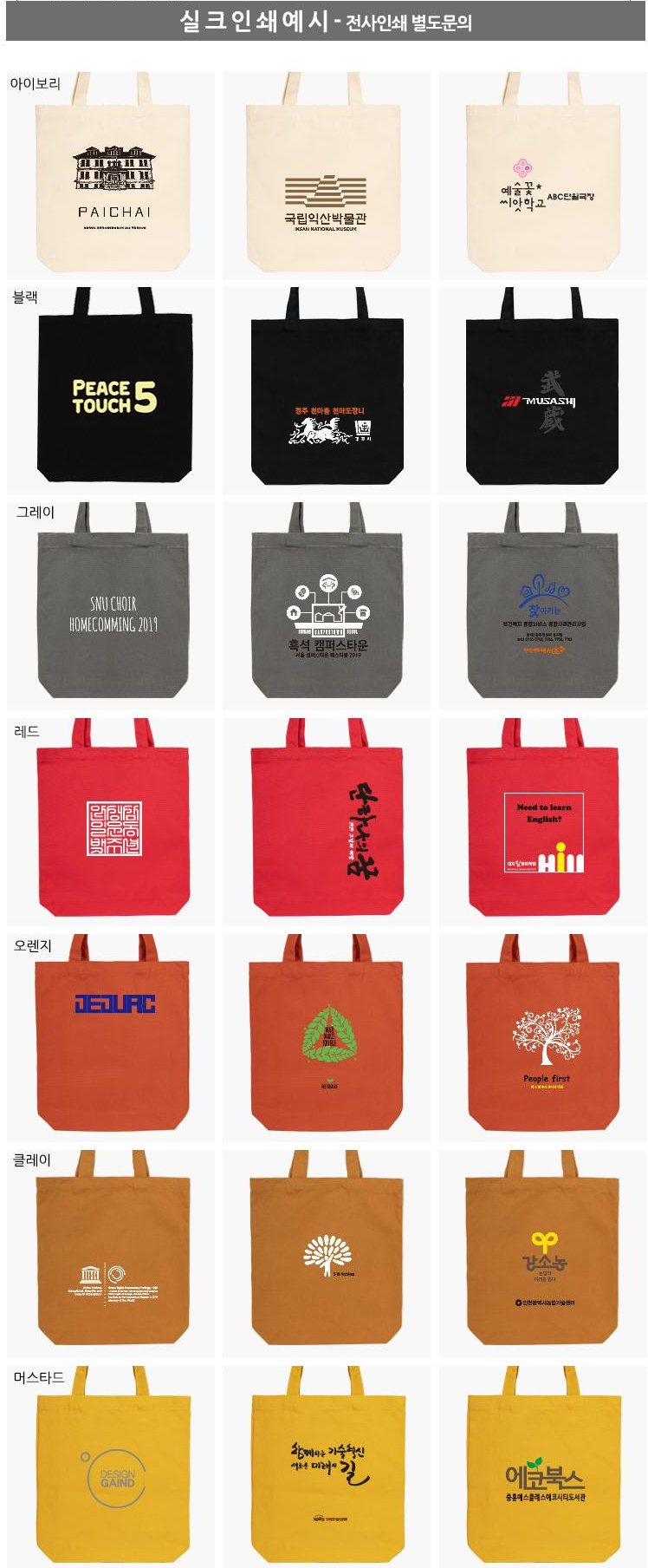 레드, 오렌지, 클레이, 머스타드, 그린, 헌트그린, 마린블루, 블루, 네이비, 연보라, 그레이프, 그레이 등 12가지 다양한 색상으로 제작 가능한 에코가방입니다. 350mm x 380mm x 80mm의 적당한 사이즈로 일상 사용에 최적화되어 있으며, 실크인쇄와 전사인쇄 두 가지 방식으로 로고나 문구를 선명하게 표현할 수 있습니다.