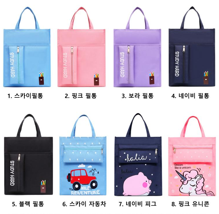 스카이필통, 핑크필통, 보라필통, 네이비필통, 블랙필통, 스카이자동차, 네이비피그, 핑크유니콘 등 8가지 화사한 디자인으로 제작됩니다. 280mm x 330mm x 100mm 사이즈로 전면에 필통형 주머니가 부착되어 있어 실용성이 뛰어나며, 내부에는 신발이나 책을 보관할 수 있는 공간이 마련되어 있습니다.