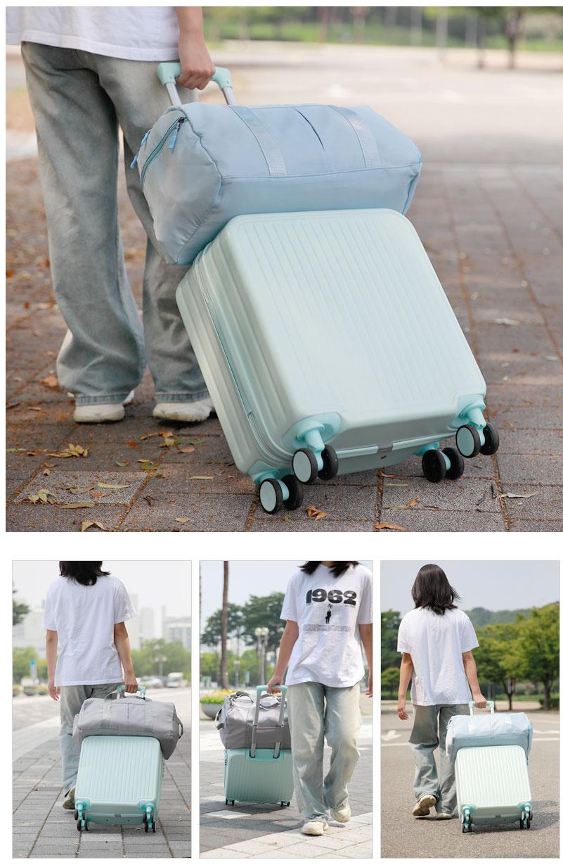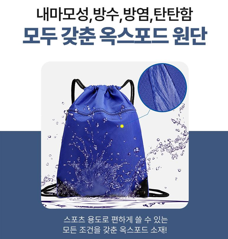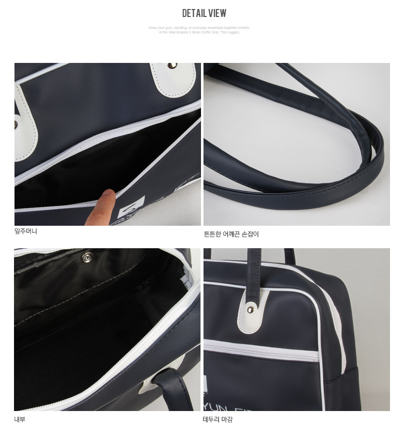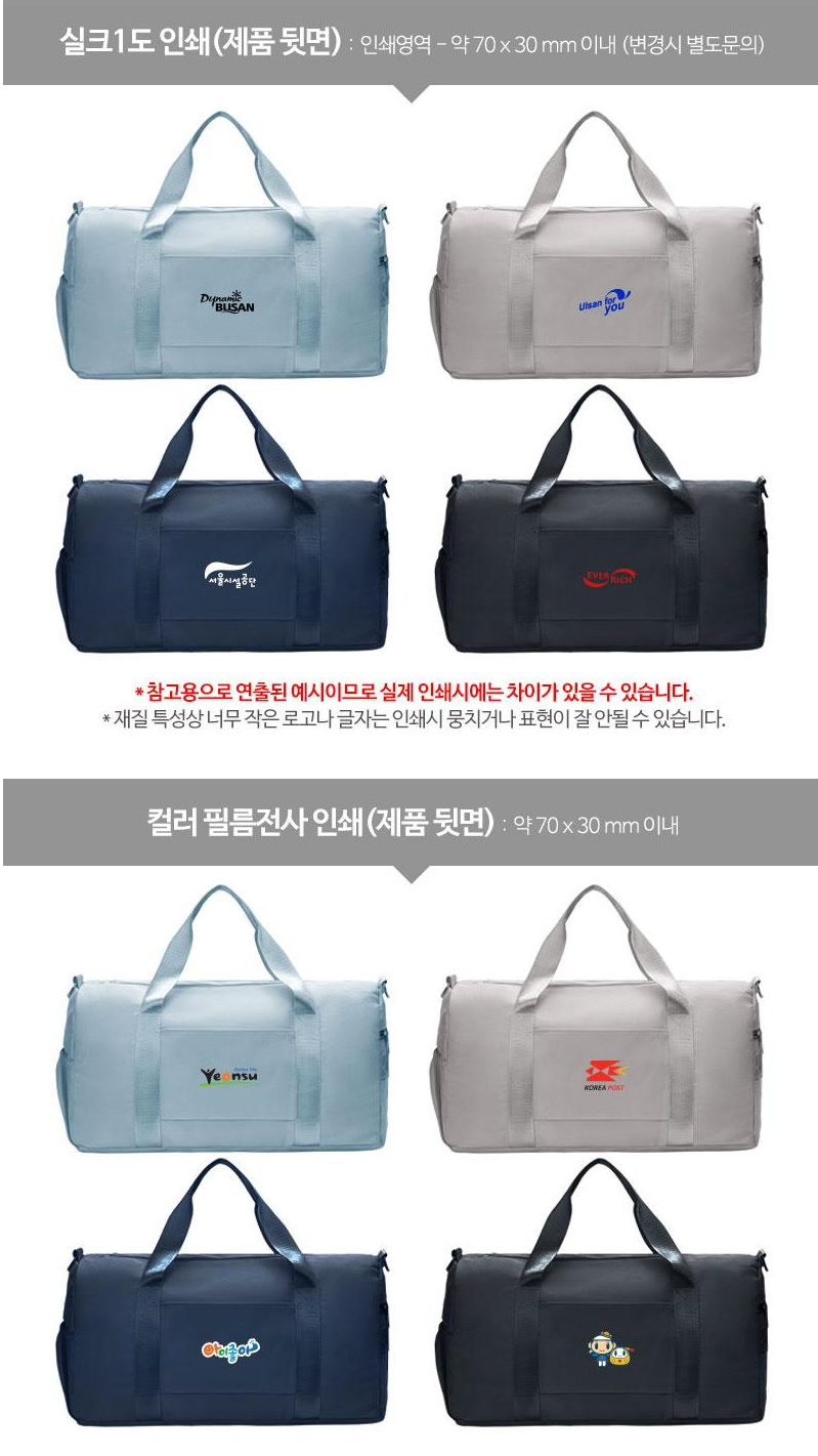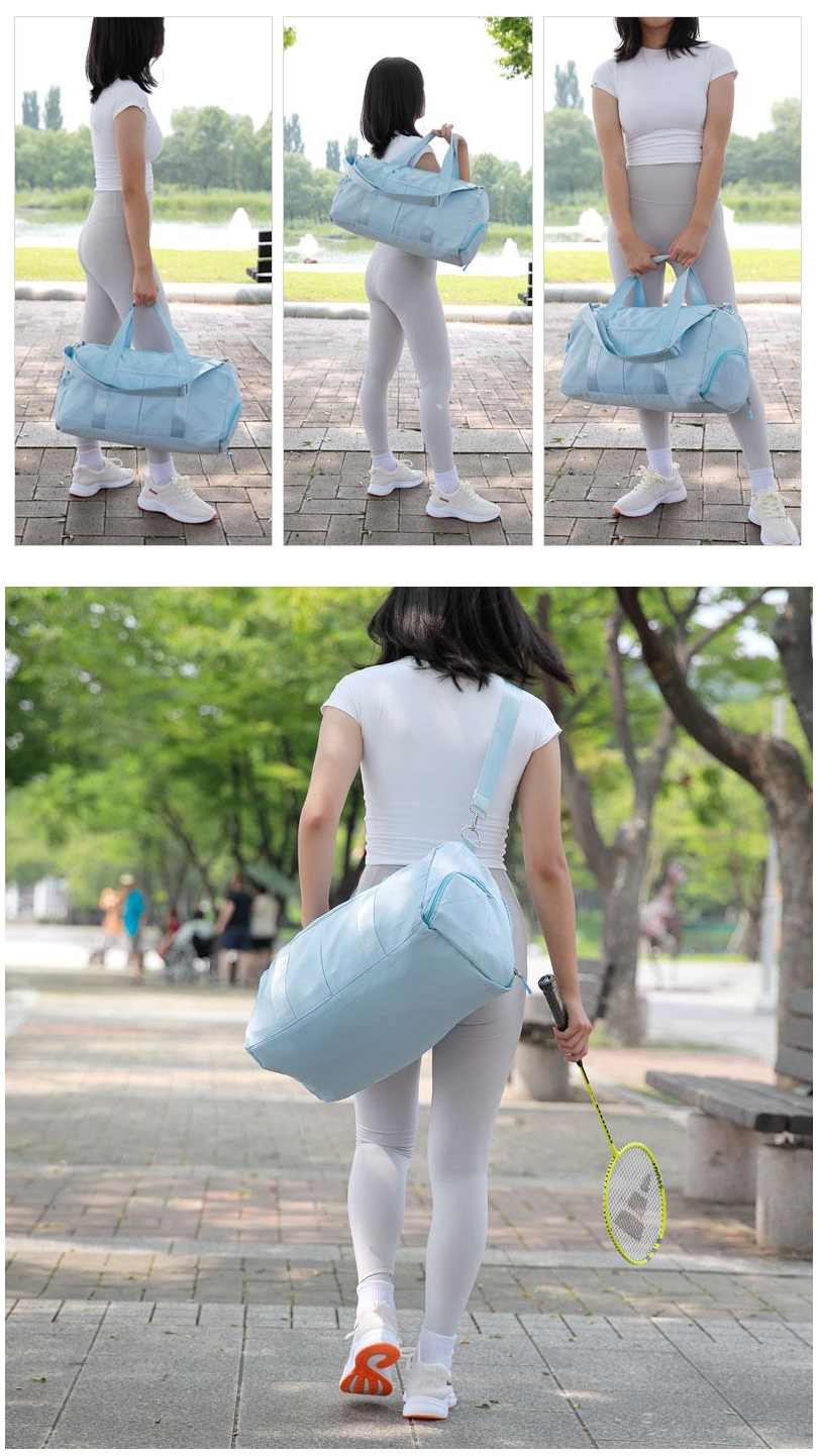 블랙, 네이비, 그레이, 스카이블루 4가지 색상으로 제작 가능하며, 젖은 운동복을 따로 넣을 수 있는 방수 구획과 운동화 분리 수납이 가능한 실용적 설계가 특징입니다. 캐리어 결합 가능한 고정 스트랩으로 여행가방으로도 활용할 수 있으며, 2개의 메인 수납공간 중 한쪽은 방수 처리되어 젖은 물건 수납이 가능합니다.