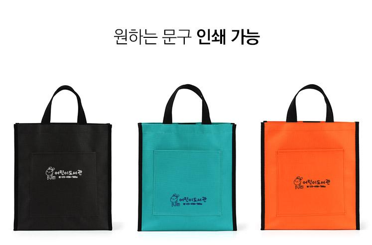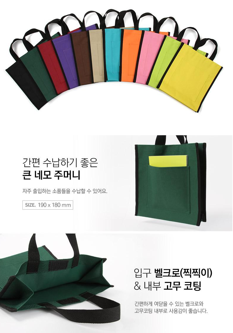 검정, 진녹색, 자주, 보라, 밤색, 베이지, 민트, 주황, 분홍, 연두, 노랑까지 11가지 다양한 색상으로 제작 가능한 학원 보조가방입니다. 책, 학교 및 학원 소지품, 신발 등을 다용도로 수납할 수 있어 실용성이 뛰어납니다. 간편하게 수납할 수 있는 앞면의 큰 네모 주머니와 입구 벨크로 여닫이, 내부 고무코팅으로 실용성과 내구성을 동시에 확보했습니다.