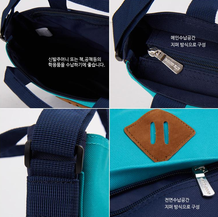 레드, 민트, 옐로우그린 3가지 색상으로 제작 가능한 크로스백 형태의 학원 보조가방입니다. 손잡이와 어깨끈으로 들거나 메기 편하며, 전면 보조포켓과 조절 가능한 어깨끈으로 편의성을 높였습니다. 신발, 공책, 책, 학용품 수납에 최적화된 구조로 메인 수납공간은 지퍼 방식으로 안전하게 보관할 수 있습니다.
