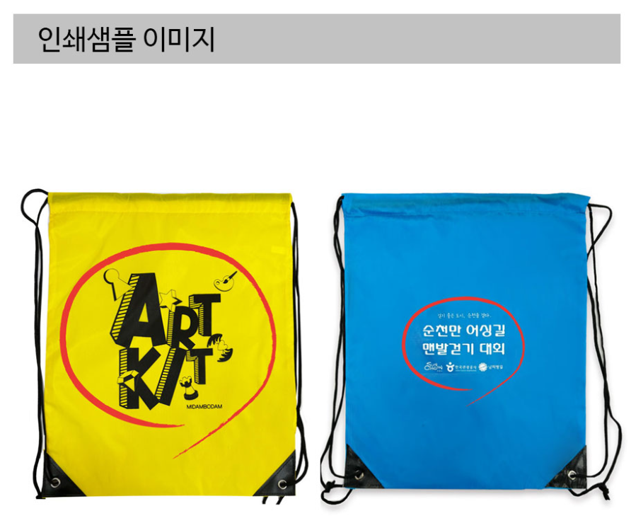 레드, 스카이블루, 그린, 오렌지, 옐로우, 핫핑크, 블랙 7가지 색상으로 제작 가능한 조리개 더스트백입니다. 신발, 옷, 소품, 학원 용품, 공 등을 수납할 수 있으며, 조리개로 조인 후 등에 멜 수 있는 편리한 구조로 설계되었습니다. 실크인쇄를 통한 학원 홍보가 가능하여 체육 관련 학원이나 활동적인 학원에 적합합니다.